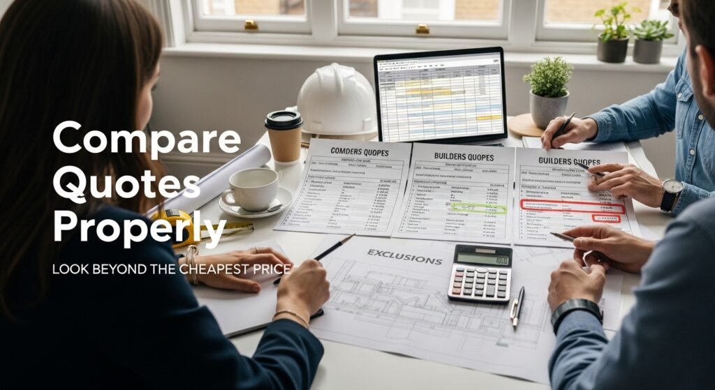 Check whether VAT is included. At 20%, this is a material difference. A quote for £80,000 plus VAT is a quote for £96,000. Ask every builder to confirm whether their quote is inclusive or exclusive of VAT.